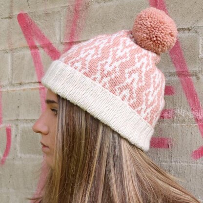 This well-proportioned beanie features an unusual style of shaping that allows the colourwork pattern to extend to the crown. The method of shaping creates faux seams that can be worn at the sides, or front and back facing. The generous rib edging can be adjusted when folded back to achieve the wearer’s desired fit. It can be topped with a large pompom.