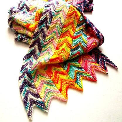 This scarf pattern shows off several mini skeins of highly-variegated yarn, arranged in simple intarsia columns. Stockinette and garter-stitch sections vary the pooling effects of the yarn, and the chevron stitch pattern adds zap.