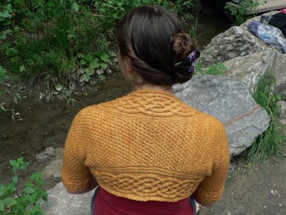 Perfect to wear over a sleeveless top or dress, this shrug is designed to fit snugly over the shoulders and back. The pattern features a Saxon braid cable, and is named for Queen Eadgyth, a 10th century Saxon princess and granddaughter of Alfred the Great.