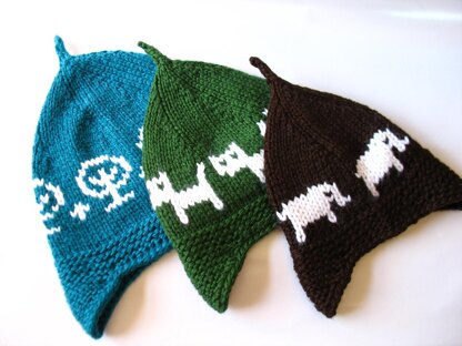 Tree, Cat, Elephant; three classic and popular motifs on Earflap Hat with pixie top. This is a quick and easy hat with bulky yarn.
