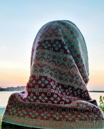 The pattern incorporates traditional Fair Isle motifs worked in four colorways of pure Shetland wool. It is a cowl that has been designed tall enough to function as a head covering as well as a neck warmer.