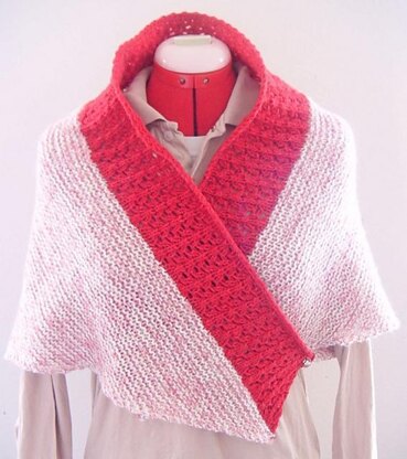It is a one piece, bottom-up trapezium with a lace collar. You can turn it into a cross-over top or a shrug by using 2 small buttons. I used the yarn-overs as button-holes. Any yarn and colour will be great for it. Gauge is unimportant.