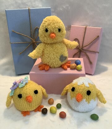 This knitting pattern is for 3 Easter Chick Chocolate Orange Covers, they are ideal for Easter gifts and are suitable for children over 3 years of age. You will need 3.5mm needles either King Cole Truffle or Big Value DK yarns for the Body, King Cole Dollymix for the Beak and Lincatex Gold coloured Goldfingering for the Heart. Also a little toy stuffing for under the Shell and a Chocolate Orange. The finished items measure approximately 8cm and 13cm high.