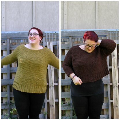 Easy A is knit in pieces and seamed. Front and back are knit from the bottom up, then shoulders are seamed. Stitches are picked up for sleeves, which are knit flat from the top down. Sides and sleeves are then seamed to finish.