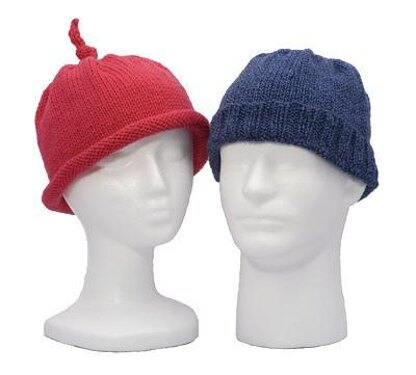 Simple and stylish hats with two brim options — rolled or ribbed — and two finishing options — a flat top or a neat topknot. Written for worsted OR chunky weight yarn.