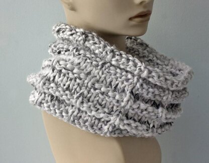 The neck warmer size is shown in the pictures but the pattern can easily be adapted to a knit larger infinity scarf.