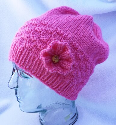 Try a textured stitch pattern in your next hat! Then, adorn the hat with a cute, easy to knit flower, that you add either a button or bead to the center, then sew to side front of hat. A perfect hat to add to your hat collection for Fall!