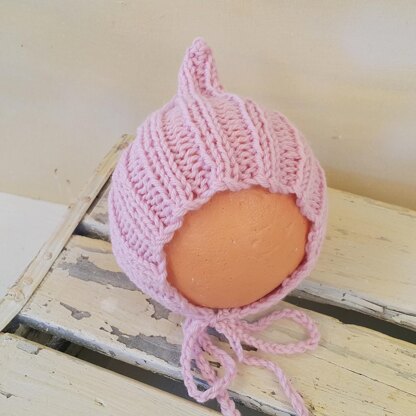 Darling little Baby Bonnet pattern for you to make yourself. The bonnet is knits up in 0-3 months and 6 months sizes, great as a photo-prop. Simple ribbed stitch, quick and easy to make