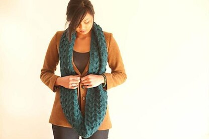 Reversible, squishy, fast and fun! This cowl is a spectacular play on stitches that is mainly a simple rib with an I-cord and cable twist thrown in every few rounds.
