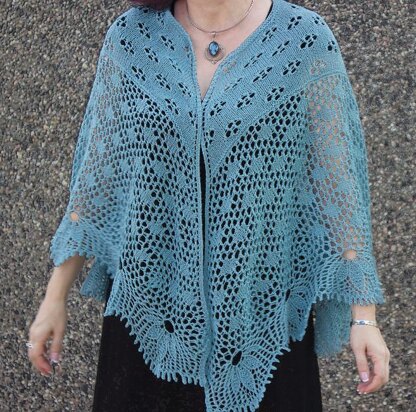 The shawl is knit from the top down, and can consist of 2, 3, or 4 triangular sections. Two sections makes a triangular shawl notched at the top to sit on your neck. Three sections makes an enveloping shawl with a square notch at the top. Four sections makes a square shape, open on one of the diagonals, again with a notch at the top.
