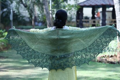 The shawl is the first of the four-shawl collection Four Seasons. It draws its name and inspiration from the beautiful, short poem by William Blake. The poem begins with a short description of children playing on a green, grassy field on a warm, spring day, and ends with the older men reminiscing about their youth, embracing the change from youth to old age. The poem contrasts youth and old age, with Spring representing life in general. This Spring shawl is a celebration of this deep philosophy of life, reflecting childhood and youth in the light green shade, and old age or the end of life in the darker green shade with the falling leaves lace.