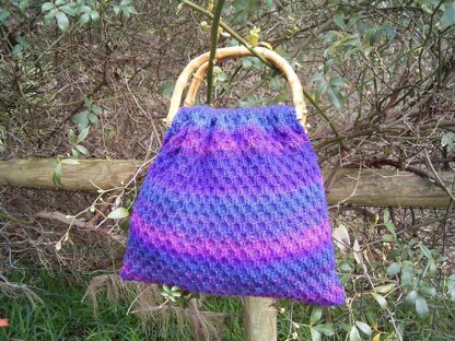 A textured bag knitted as a simple rectangle with no shaping. There are only side seams and handle casings to sew. The bag is knitted on smaller needles to create a firmer fabric. Additional materials required: 1 cable needle, Woven fabric for lining, 1 pair of Bamboo handles measuring 21cm (8¼ in)