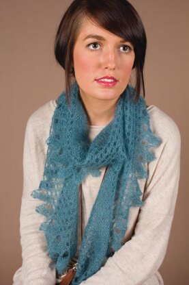 This scarf is worked by casting on the full length of the scarf, working a small section in garter stitch with short row shaping (to create a deeper scarf at the centre point than the outer edges) before knitting on a deep lace edging.