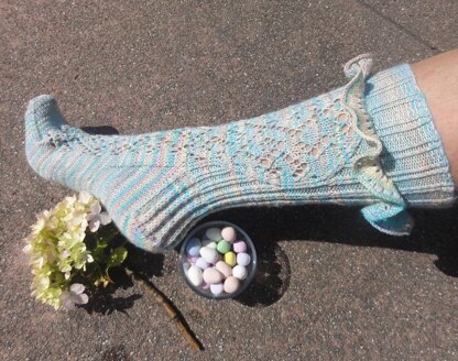 The second sock in the TRIBUTE SERIES, This sock was inspired by Effie Trinket, A character from The Hunger Games trilogy by Suzanne Collins. She is a bubbly, effervescent, confection of a woman. Optimistic and perpetually perky, she is the official spokeswoman and liaison between the CAPITOL and District 12. Her personal style is very bright, bubbly, curvy and colorful. She’s the kind of woman who would put a ruffle on a ruffle and is not afraid of pink!