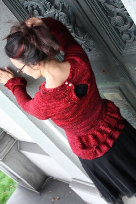 A long sleeved, historically inspired gothic fancy, this sweater has unique details such as a peplum, buttoned lace cuffs, ruffled neckline and three-button keyhole closure at the back of the neck.