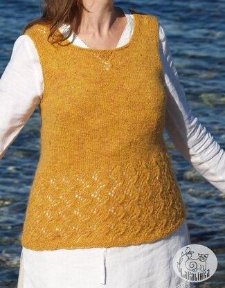 Design details: ● vest with lace pattern ● seamless, worked in one piece ● worked from the bottom up to the underarm in the round ● small lace patterns on shoulders, front and back neck ● darts for Sizes S – XL ● short rows shaping