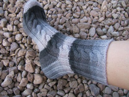 This fun cable and rib pattern adds interest to the stripes on these top-down, sport weight socks with a Dutch heel.