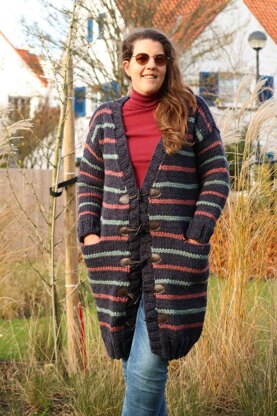 /PATTERN DETAILS • XS to 5XL • Easy knit • Between a cardigan and a coat: coatigan • Uses chunky yarn which makes it quick and warm.