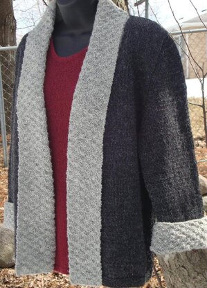 This jacket design incorporates both worsted and sport weight yarn. The body is worked in worsted and uses between 1100 - 1540 yds, the collar and cuffs are worked in contrasting sport weight and use 700 yds. Sleeves are 3/4 length.