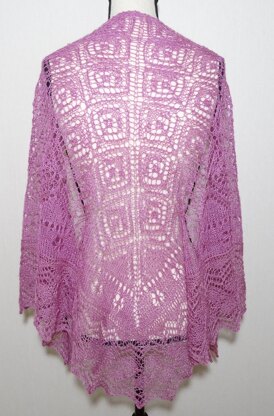 Eleonore shawl starts at the center back of the neck with a garter tab and is knit down to the bottom edge. After the body is completed, a knitted-on border is attached at right angles to the body.