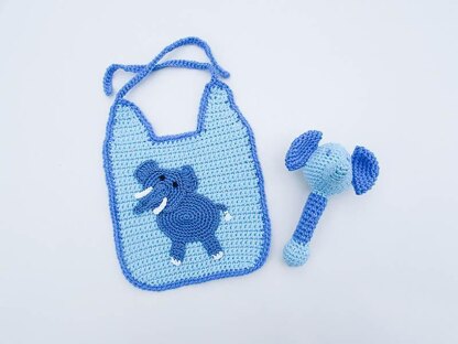 Adorably cute Elephant Baby Bib and Baby Rattle Pattern with Elephant Applique, very easy and quick to make with lots of pictures to help you along the way. Perfect gift for the perfect baby.