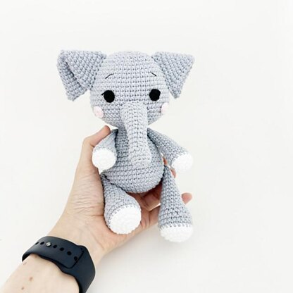 The elephant measures approximately 19 cm in a seated position when using the materials mentioned above. If you are using yarn with a different gauge the toy’s measurements will change.