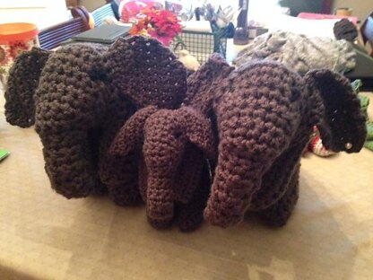 I wanted to make an Elephant family for a friend who was having a baby boy and this is what I came up with. The Baby is made using an I hook and one strand of worsted weight yarn at a gauge of 12 sts = 3". For the Adult Elephant, I used double strand of worsted weight yarn held together and an L hook at a gauge of 7 sts =3". Both are made the same. The Elephant pattern produces a flat piece that you sew up and stuff to give it shape. I used short rows on the head. Enjoy!