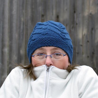 This cute little beanie features a variation on the dotted chevron pattern. Extra warmth around the ears from a slipped stitch design that looks a bit like chain mail. No cold is getting through there!