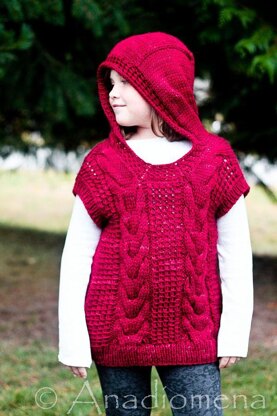 Elfen Vest is a unisex design that features big bulky cables, textured stich, nice comfy hood, and pockets.