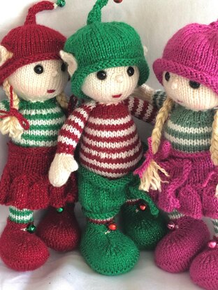 The Elfie Twins stand at approximately 8 inches or 20cms. They are knitted flat and assembled. The feet, legs, body and head is knitted as one piece, ears and arms are knitted separately. Girlie Elfie has little pig tails poking from under the brim of her hat and a sweet fluted skirt. Little boy Elfie has big breeches, needs to grow a little to keep them up! They are both worked flat on 2 knitting needles using Double Knitting/lightweight worsted yarn, only take small amounts of leftovers from your stash and are a quick knit. I always include a full making up guide with lots of photos of each step of assembly and a couple of quick tips to help you create a sweet Elfie.