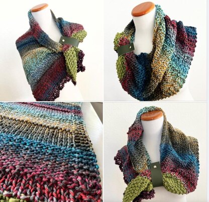 A colorful and rich in texture wrap knitted for the season, the Elix wrap. Create a pretty lace border with a thick boucle yarn, followed by a wide horizontal ribbing that gets decreased towards the Seed stitch portion preceding the simple contrasting garter border end to give you a “collar styling option. Before you get to the garter stitch edge you decrease the colorful ribbing section. The unblocked dimensions: 39.5” overall length, 17“ in middle height and 12“ at skinny edge. An option is given to extend the length in the Seed stitch section.