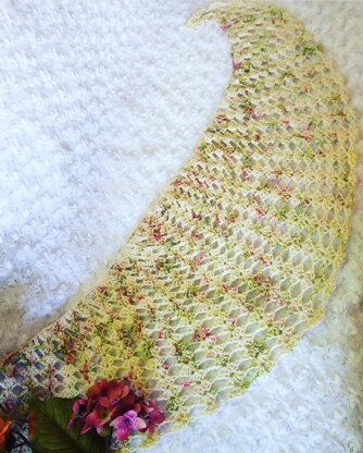 For the shawlette as pictured, you'll need approximately 210 yards of a DK-weight merino wool yarn. (Featured is Knot Your Momma's Yarn 100% merino in colorway Grandma's Garden.) You'll also need a US-I 9.0/5.50mm hook, tapestry needle, and scissors. To use a different yarn size, the amount of yardage will differ to make this same size (12x40") and I would recommend using a hook that's at least 1 size up from what's recommended for your yarn of choice.