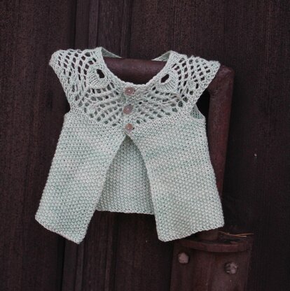 Elizabeth Elain Lynn has a vintage feel to it and will become an heirloom piece to be handed down from baby to baby. Top down construction, with a 3 button closer. Suitable for Fingering or Sport.