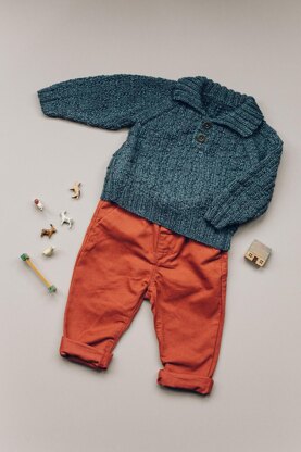 Textured sweater with collar and button detail at neck.