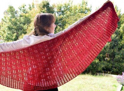 Simple daisy eyelet lace forms the body of the shawl before smoothly transforming into the flower lace edging for a soft romantic feel. The shawl is worked from the top down with easy increases every row to create the crescent shape.