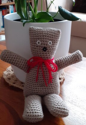 I designed this bear as I wanted to create a toy which could be carried around and loved without it being too fragile or too bulky. This bear is a bit taller than the length of a piece of paper, and has a crease between torso and legs so that s/he can be sat up nearby to wherever the owner might be.