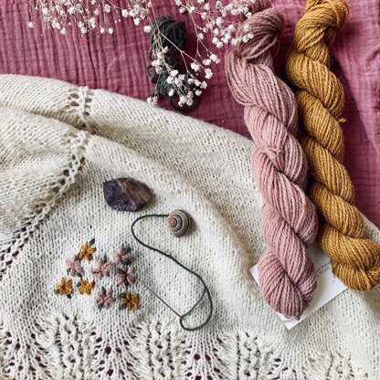 The inspiration for this shawl came from my grandmother. She was a kind and wise person. In this shawl, I combine my love for nature and handcrafts. Nord is a very rustic yarn and produced locally to me, which makes it perfect for this kind of project. It is a thick fingering yarn in natural colours, that keeps you warm, but is still lightweight. I chose to make a floral design, but embroidery gives you the opportunity to make whatever you want. You can tell your own story with this shawl.