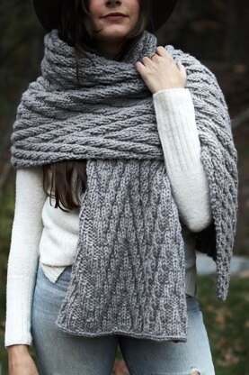 Squishy columns of chevrons and diamonds pop in this oversized blanket scarf, presenting a modern take on a classic concept. The embossed, reversible fabric looks almost cable-like but is achieved using only knits and purls for a satisfyingly addicting project that’s suitable for beginners.