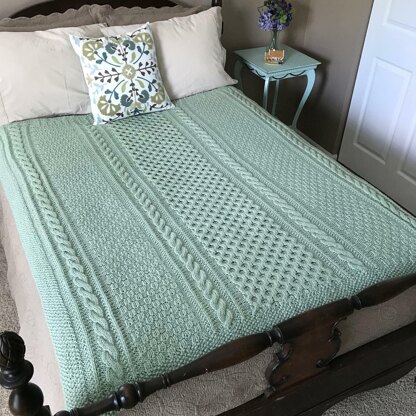 This pattern incorporates 5 different cable elements to create a super cozy, 50"x 60" blanket that is full of rich texture.