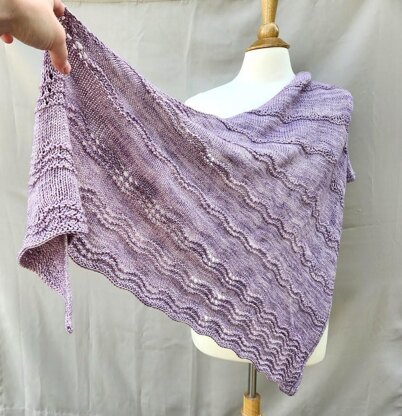 This lovely shawl features an elegant ripple pattern, complimented nicely by the hand dyed yarn.