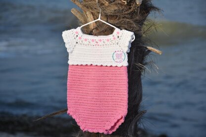 This enchanting crochet pattern creates a beautiful baby girl romper in size 0–3 months, featuring delicate beads elegantly arranged around the scalloped neckline for a touch of elegance and charm.