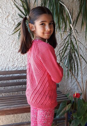 En pointillés is a cardigan with lace pattern on fronts and back. The lines of little holes of the front are going on the back and form a nice design.
