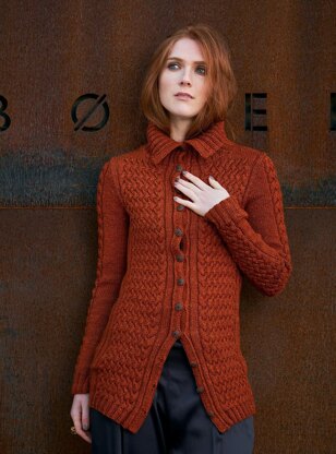 Ena is Celtic for fiery. As you need to be passionate about cables to make this jacket. The woven cables lean towards the left and the right hence the spine has been accentuated with a twisted stitch at the center back and along front opening. Ribbing in the sides make the jacket appear casually fitted. The collar in rib can be worn open or closed and folded over. Ena is knitted in the rustic Acadia with silk noil from The Fibre Company.