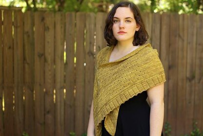 Knit from the bottom up, this stole features a pleated ruffle and then a row of beads framed by horizontal braids. The body is knit in a textured eyelet stitch. The sides of the stole are slanted to give a tilted rectangle shape. The top edge of the stole features the framed beads again plus a tiny ruffle.