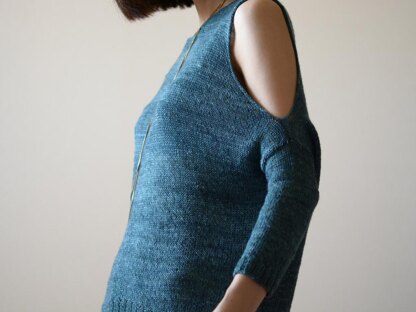 Enchantment is an oversized pullover with open slits on the upper arms. It is worked from the top down in one piece: the front and back are worked back and forth separately to the underarm, then joined to be knitted in the round to the hem. German short rows are used to shape the shoulders and the back neckline. The sides of body are worked longer than the middle of body also with German short rows. Sleeves are worked from the top down in the round after the body is finished.