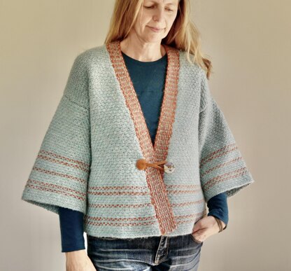 Enclose is a layering garment with sleeveless, mid and long sleeve options. It features woven stitch with contrast colour rows, and linen stitch for structural bands. Knitted bottom up in pieces on circular needles so stitches can be slid to the end of needle for contrast rows. Recommended ease 10-20cm. Heavy worsted and aran weight yarns recommended.