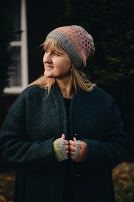 The hat is accompanied by End of Summer Mitts with the same motif.