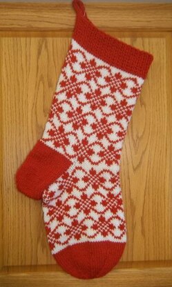 As the result of a trip to Norway, I was inspired by the beautiful designs that were used in the knitting from Selbu, the home of the now famous “Selbu Mittens”. The museum in Selbu, Norway has some wonderful pieces of knitting history. This Christmas stocking has borders of “endless roses”, a typical Norwegian motif used in hats, mittens, socks and sweaters. I saw many examples of these roses in the Selbu museum. Techniques used in this stocking are broken rib for the cuff at the top of the stocking, knitting with two colors at the same time, catching floats, working a flap heel with the decreases at the bottom as they were knit on some of the Bunad stockings from the traditional Norwegian national costumes, a round toe and an I-cord hanging loop. In worsted weight this is a generously sized stocking with a finished size of about 16 inches around and 23.5 inches top to toe. My sample is worked in a heavy worsted weight but a finer yarn could be used to make a smaller stocking.