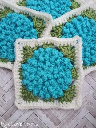 This afghan square was originally designed as part of my Endless Summer Tote Bag, but there are endless possibilities of what you can create with just this square alone! Video tutorial included. For my square, I used a small amount of Red Heart Super Saver in Soft White, Turqua and Tea Leaf Green together with a H8/5mm crochet hook, but you can use any weight yarn with respective hook size depending on the size you want and project in mind. Example, the square I made in Super Saver turned out to be 4.75", while one I worked in WeCrochet Dishe with a H8/5mm hook turned out to be 4.88".