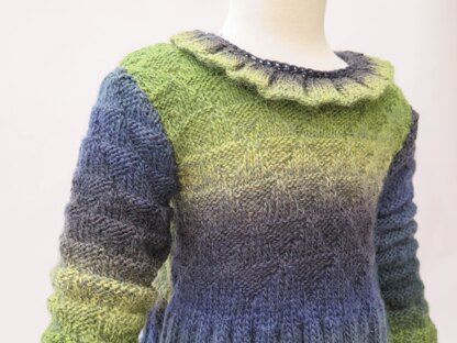 I've always had a soft spot for English Country Chic. I just love those green and blue colours and that style that looks casual, yet has a bit of class. This dress design tries to capture the essence of English Country Charm. Pleats and triangles combined with colour changing yarn in greens and blues to give a tweedy look. Dress pattern features pleated skirt, sleeve cuffs and collar, as well as a button closure at back. Perfect winter outfit for girls. This is a flat knit design. Pattern comes in four sizes: 1-2 years, 2-3 years, 3-5 years, 5-7 years Dress will measure about 45, 50, 56, 62 cm or 18 (19, 22, 24 1/2) inches from back of neck. It is designed to fit chests of about 48-51 (51-56, 56-61, 61-66) cm or 19-20(20-22, 22- 24, 24-26) inches. Materials: 250 (300, 350, 400) g Sports or Baby Weight wool yarn.